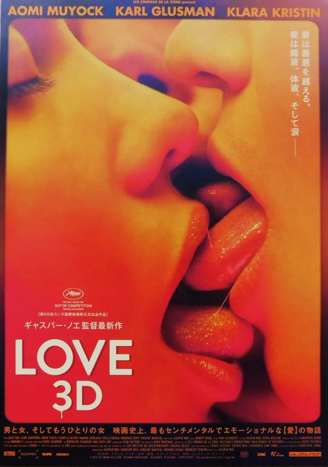 Treize ans plus tard, Love marque un tournant. L’affiche joue cette fois la carte du choc explicite : un baiser sexuellement chargé, capturé au plus près, saturé de couleurs chaudes. Pas de détour : l’image assume le caractère pornographique et intime du film, brouillant les frontières entre cinéma d’auteur et cinéma érotique. Ici, l’affiche n’accompagne pas seulement le film, elle devient manifeste. (Cliquer sur la photo...)