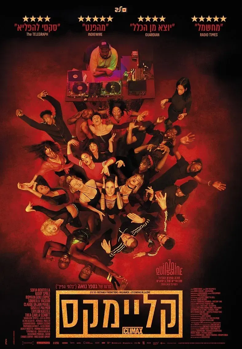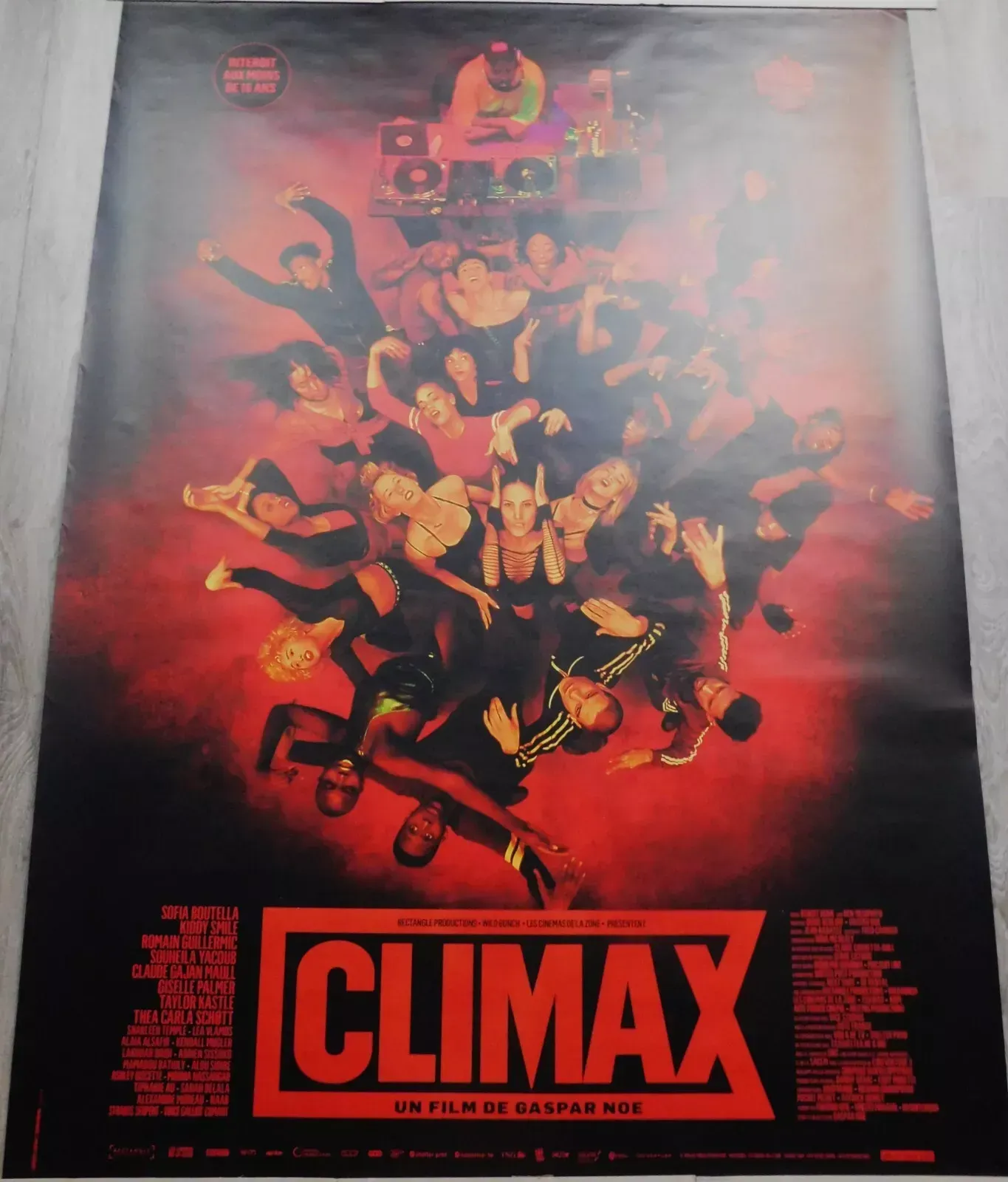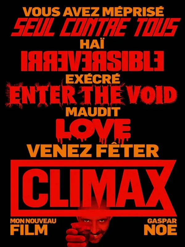 Gaspar Noé a initialement imaginé une affiche dépliable pour le dossier de presse à Cannes, avec un ton ironique rappelant les critiques subies par ses films précédents. Le slogan « Vous avez méprisé Seul contre tous, haï Irréversible, exécré Enter the Void, maudit Love, venez fêter Climax » en est l’expression textuelle clé. C’est Laurent Lufroy, son fidèle affichiste, qui reprend cette idée en visuel fort, mêlant histoire personnelle et provocation graphique.