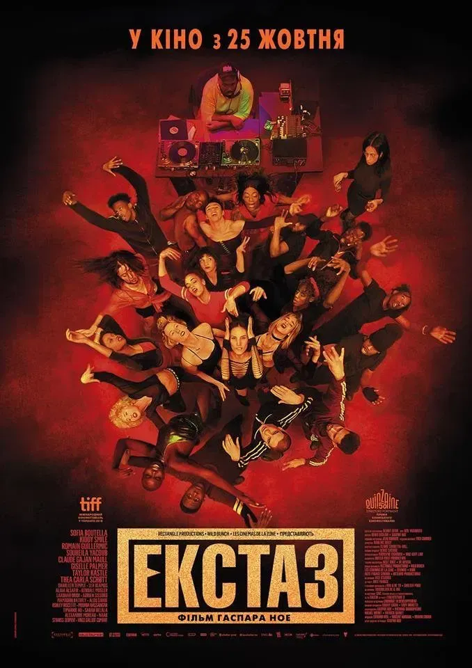 Impossible d’échapper à la couleur : le rouge occupe la totalité de l’affiche. Il évoque simultanément la passion, le sang, la transe, mais aussi le danger. Plus qu’un simple choix esthétique, cette teinte saturée traduit la montée progressive du malaise dans le film, où une fête de danse tourne au cauchemar collectif. Le rouge, c’est aussi la lumière de la discothèque, le feu intérieur des corps, l’alerte visuelle qui dit au spectateur : “préparez-vous, vous entrez en zone extrême”.
