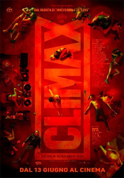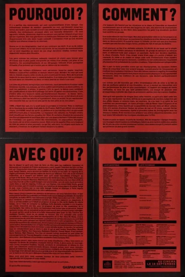 Gaspar Noé a initialement imaginé une affiche dépliable pour le dossier de presse à Cannes, avec un ton ironique rappelant les critiques subies par ses films précédents. Le slogan « Vous avez méprisé Seul contre tous, haï Irréversible, exécré Enter the Void, maudit Love, venez fêter Climax » en est l’expression textuelle clé. C’est Laurent Lufroy, son fidèle affichiste, qui reprend cette idée en visuel fort, mêlant histoire personnelle et provocation graphique.
