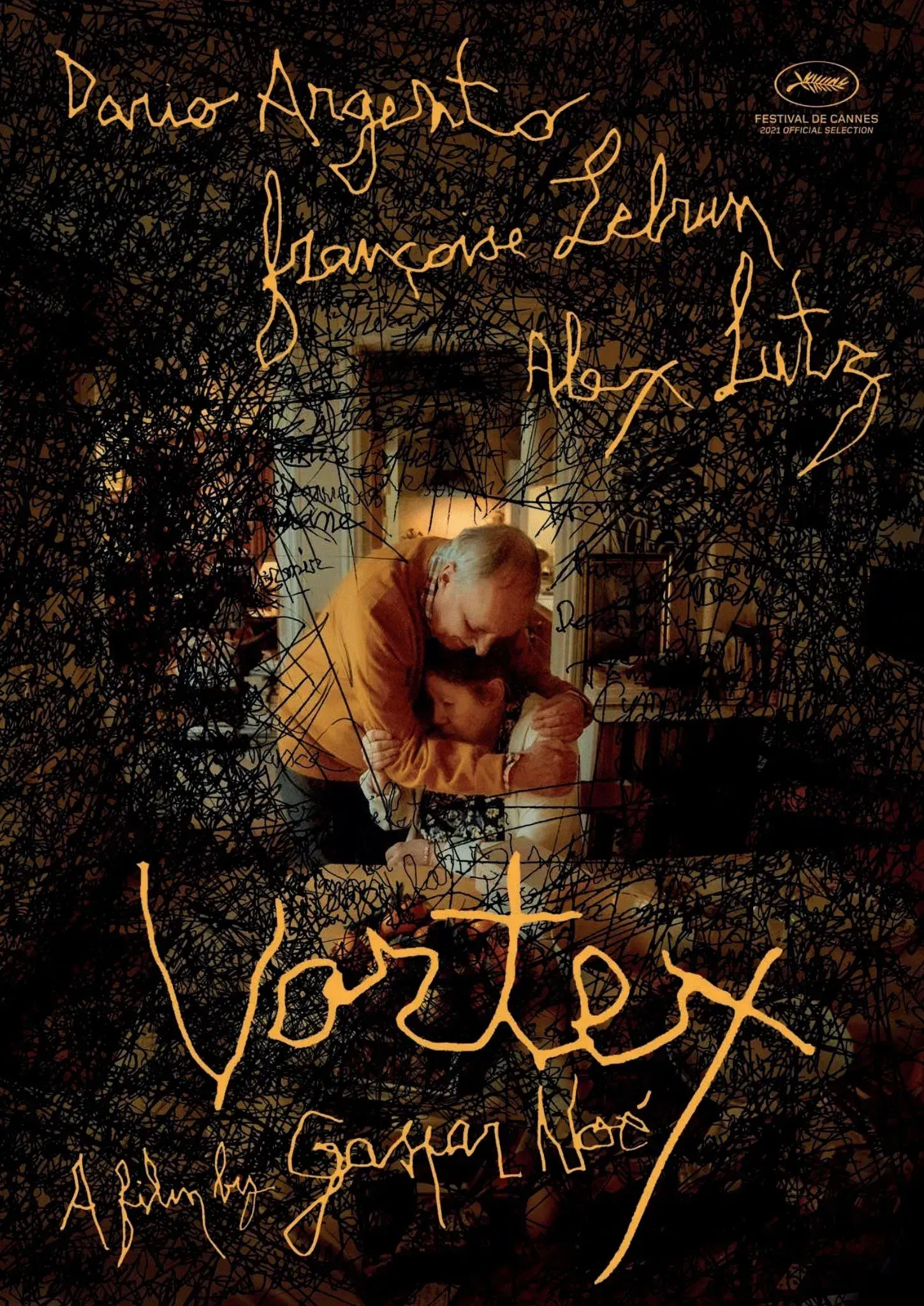 Pour Vortex, Gaspar Noé confie l’affiche à Laurent Lufroy, maître de l’image cinématographique et auteur de centaines de visuels pour Godard, Lynch ou Carax. Résultat : une composition saisissante, dominée par des rouges et des oranges brûlants, sur laquelle le titre semble griffonné à la hâte, nerveux, instable.